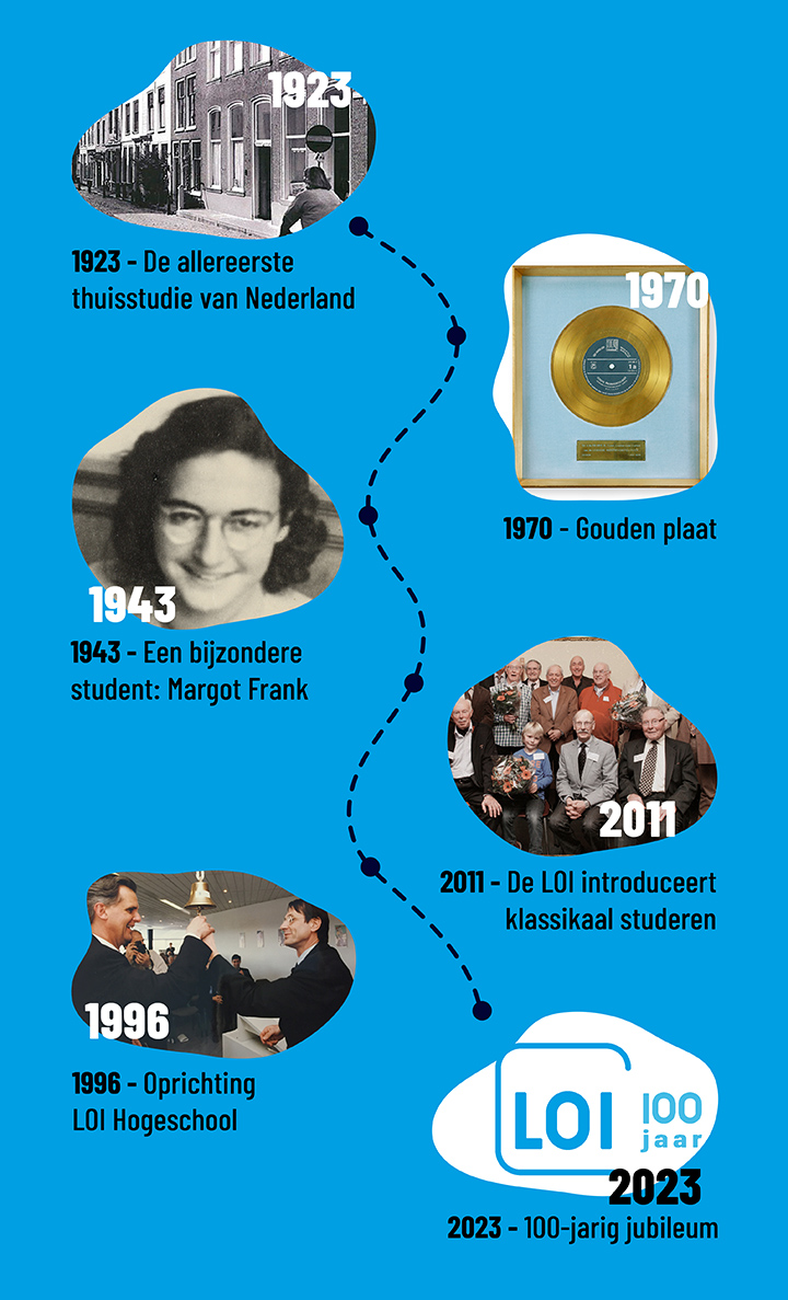 Jaarlijks volgen bijna 100.000 mensen een opleiding bij de LOI. Wij zijn trots en dankbaar dat we studenten nu al 100 jaar helpen bij het verwezenlijken van hun dromen en doelen. Maar elk succesverhaal is ergens begonnen. Wist je dat de heer I. J. Sloos op 23-jarige leeftijd begon met één cursus Boekhouden? Inmiddels hebben we een heel divers aanbod en bieden we vandaag de dag bijna 1.000 cursussen en opleidingen op alle niveaus.